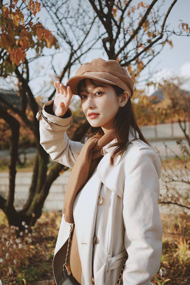 Tiết trời mùa đông se lạnh ở Hàn Quốc, diễn viên xinh đẹp Jun Vũ tỏa nắng với sắc màu camel nền nã khi cô mix cùng lúc đầm liền và mũ baker boy rất ăn ý.