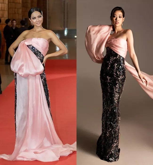 Đây không phải lần đầu Khánh Vân có màn "đụng hàng" so kè với dàn hậu. Trước đó, chân dài sinh năm 1995 lấn át H'Hen Niê khi diện chung chiếc đầm đuôi cá có điểm nhấn là vạt hồng dài quét đất.