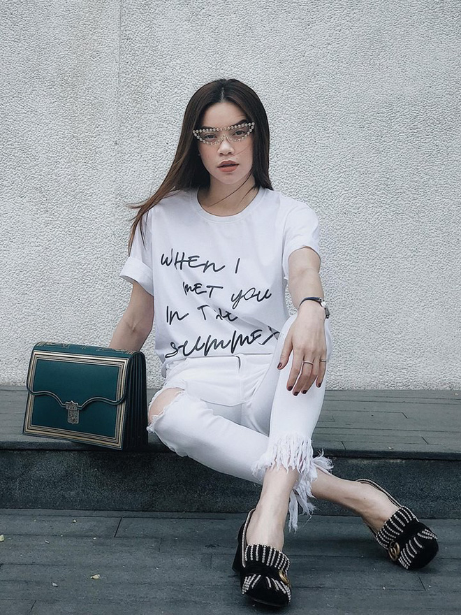 Màn "đụng hàng" street style của tuần qua đã xảy ra giữa hai cái tên trứ danh: Hồ Ngọc Hà và Minh Tú. Cả hai đều kết hợp chiếc áo thun trắng in slogan mùa hè theo cách thức khác biệt: Hà Hồ thì diện cả cây trắng thanh lịch trong khi Minh Tú vẫn phát triển phong cách theo hướng sporty-chic quen thuộc.