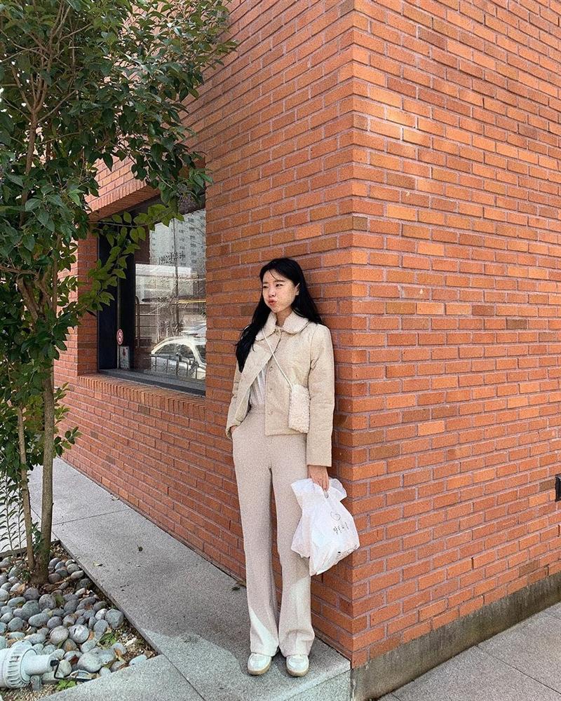 Thêm một ý tưởng diện đồ màu trà sữa tuyệt hay với áo len cổ chữ V và quần ống đứng. Set đồ này rất nhã mà cũng rất trẻ trung, đặc biệt là khi có sự xuất hiện của đôi sneaker trắng.