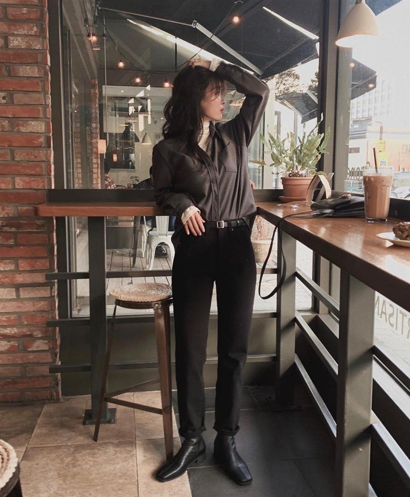 Set đồ với màu đen làm chủ đạo này toát lên sự cá tính nhưng cũng không kém phần thời thượng. Để ứng dụng outfit này trong những ngày lạnh, bạn hãy layer bên trong áo sơ mi một chiếc áo cổ lọ.