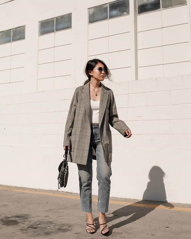 Cách diện set đồ với áo thun tối giản sơ vin với quần jeans, khoác thêm chiếc blazer thời thượng cũng là gợi ý không tồi cho các nàng muốn giấu dáng kém thon.