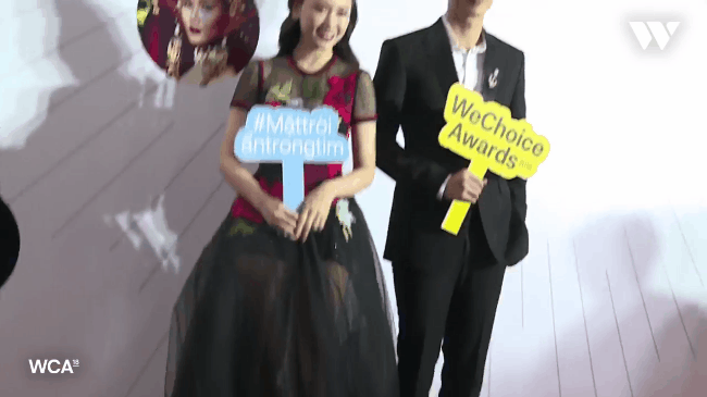 Chi tiết xuyên thấu sexy ở ngực khiến Hari Won hơi bối rối, bà xã Trấn Thành ngại ngùng lấy tay che chắn vòng 1 trước ống kính máy ảnh.
