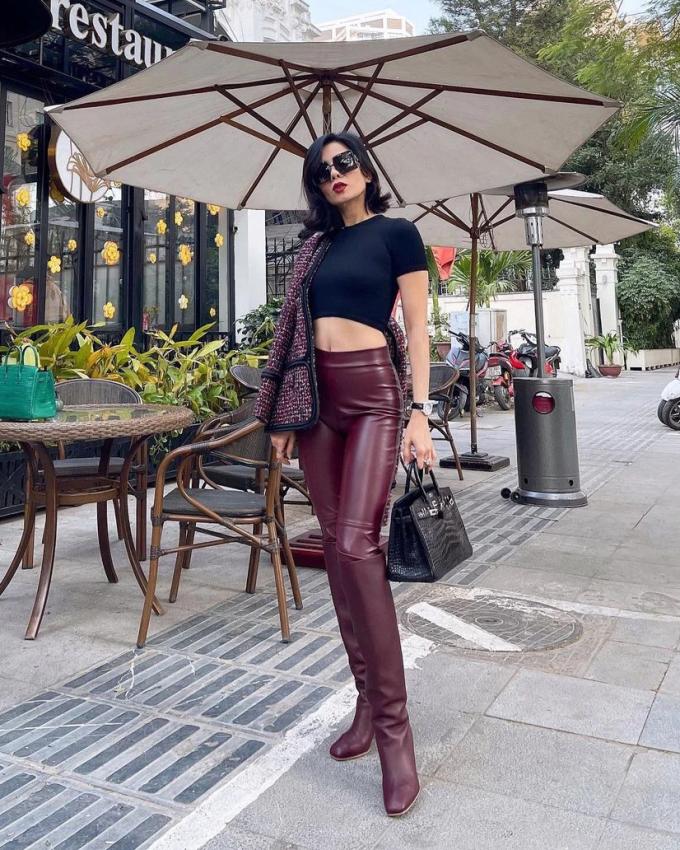 Lệ Quyên thường mix&match quần da với các item như áo lông, áo khoác vải tweed...để tăng độ sang chảnh.
