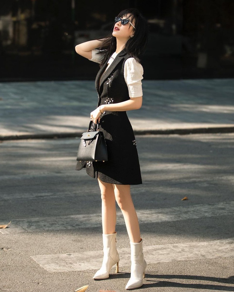 Sơ mi tay bồng và đầm đen thắt eo được Hà Thu diện cùng boots cao gót, điểm trang túi Hermès. Layer trang phục tối giản đã tôn được vẻ thanh lịch, sang trọng của mỹ nhân 9X.