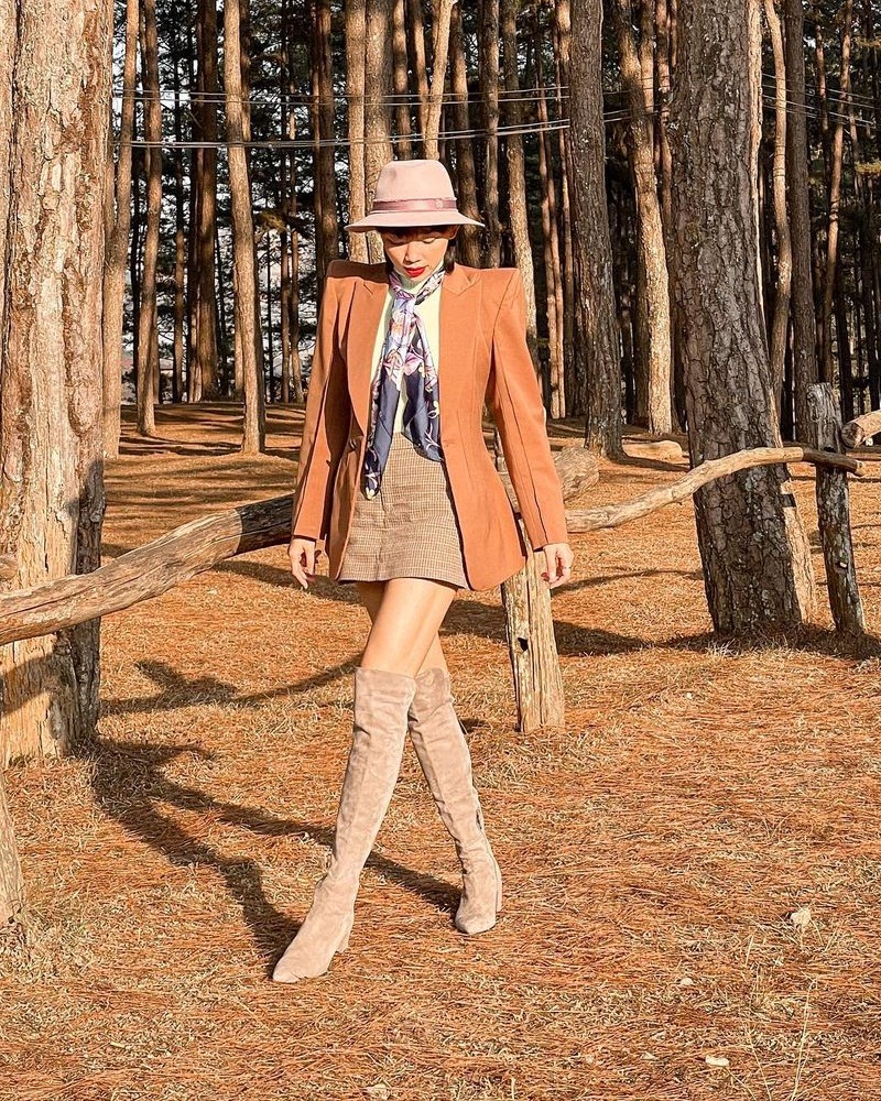 Tóc Tiên lăng-xê style Retro cổ điển với áo blazer độn vai và chân váy, boots nâu nhạt rất phù hợp để thả dáng ở Đà Lạt.