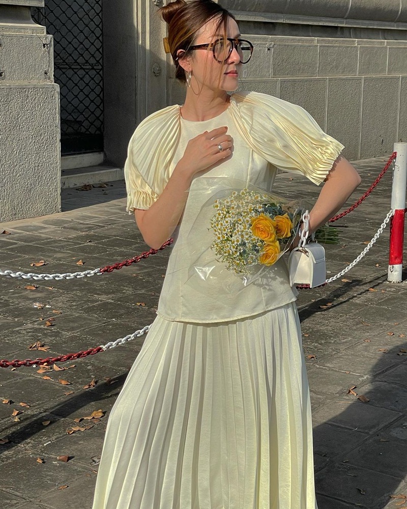 Yến Nhi thể hiện đam mê với các item xếp nếp. Cô nàng chọn áo blouse tay xếp và chân váy xếp ly, phối màu vàng pastel ăn ý, tăng vẻ nữ tính, nhẹ nhàng.