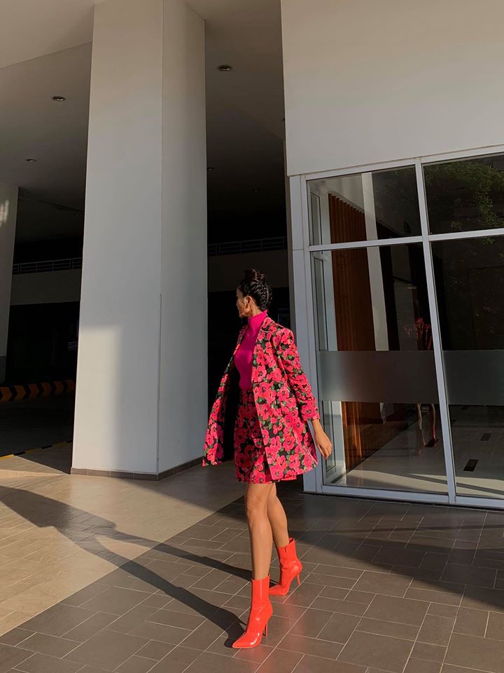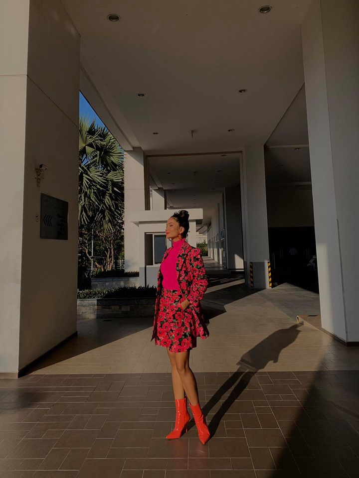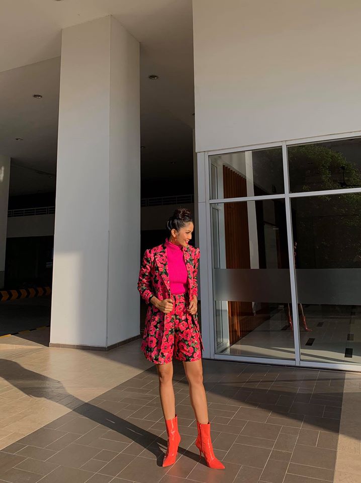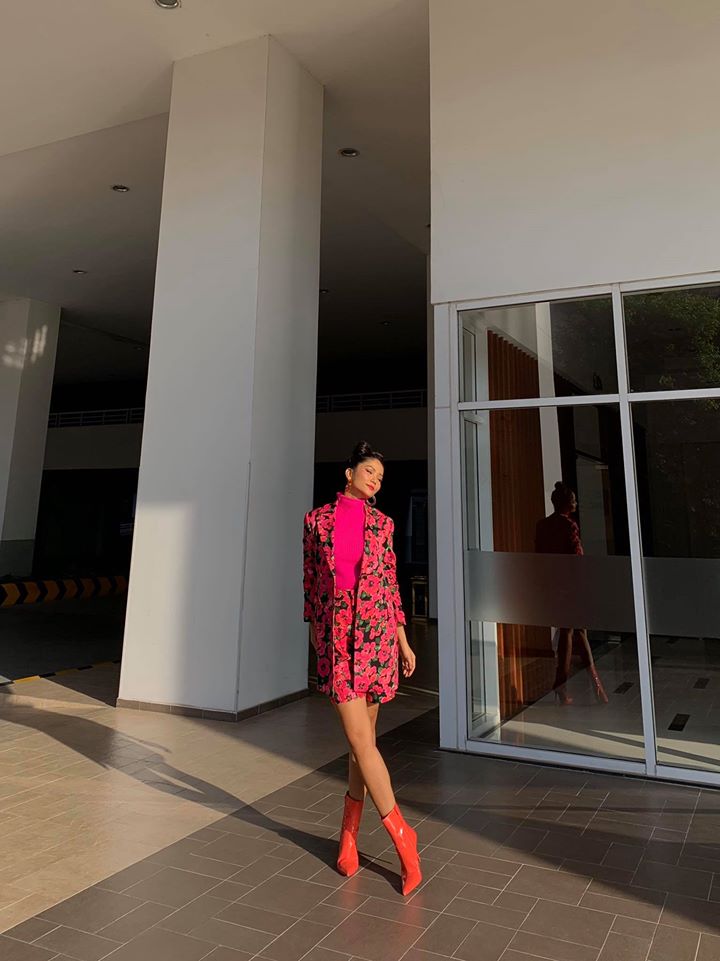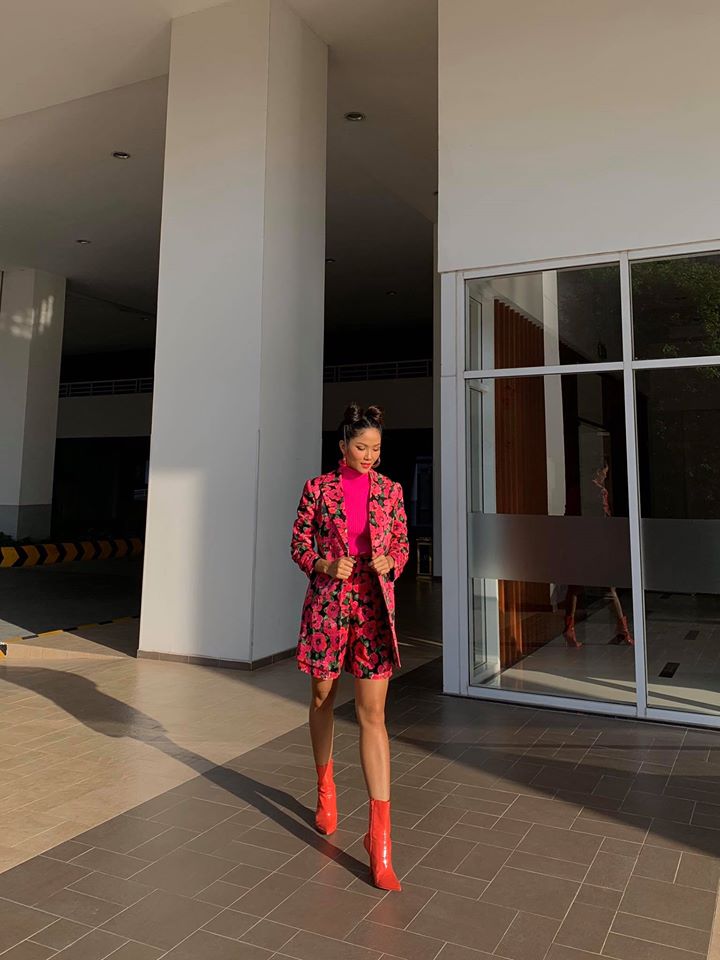 Mới đây, người đẹp Ê-đê chào xuân với một set trang phục không thể nổi hơn: set blazer và quần short hoa, áo len tông fuchsia và boots màu cam.