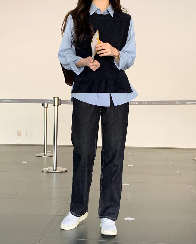 Combo áo sơ mi + gilet len và quần jeans tối màu này rất hợp xu hướng. Đây là cách lên đồ trẻ trung, ngọt ngào mà vẫn cực kỳ thanh lịch. Đôi giày sneaker trắng được coi là mảnh ghép hoàn hảo của outfit trendy này.