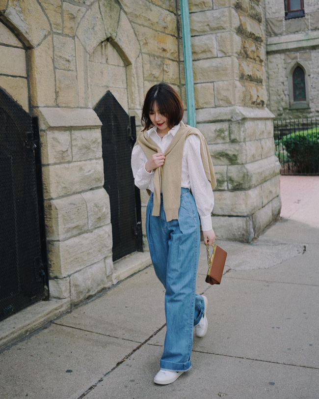 Áo sơ mi trắng tay bồng + quần jeans ống suông tưởng là lựa chọn "thường thường", nhưng ai ngờ lại mang đến cho người mặc vẻ ngoài rất chanh sả. Bộ đồ còn trở nên ấn tượng hơn nữa nhờ chiếc áo len quàng vai, và đôi giày sneaker trắng đầy phong cách.