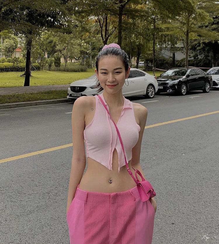 Sĩ Thanh khoe cơ bụng săn chắc mốt áo croptop màu hồng khoét lưng kết hợp với quần họa tiết ngựa vằn nổi bật.