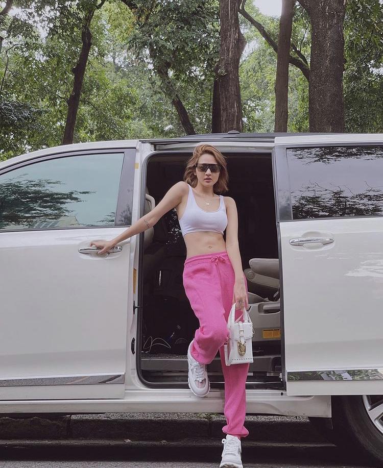 Bảo Anh ''lên đồ'' với sắc hồng và trắng theo phong cách thể thao gồm áo bratop, quần jogger, túi mini và sneaker hầm hố.