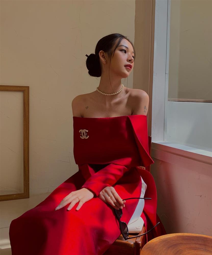 Ngày Mùng 1 Tết, cô nàng chọn áo dài cách tân phom trễ vai với sắc đỏ quen thuộc, vừa sang chảnh lại vừa hiện đại, thu hút. Phí Phương Anh không phối quá nhiều phụ kiện, áp dụng đúng công thức 'ít mà chất'. Chiếc cài áo logo Chanel và vòng cổ ngọc trai của cô nàng hoàn toàn chiếm trọn spotlight nhưng lại không khiến trang phục bị 'dìm'.