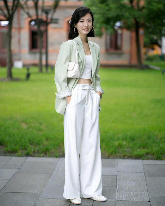 Bằng việc chọn thêm một chiếc blazer khoác ngoài mà set đồ với áo croptop + quần cạp cao của cô nàng này không hề hở hang, trái lại nhìn còn rất sang xịn đúng chuẩn một cô nàng có gu.