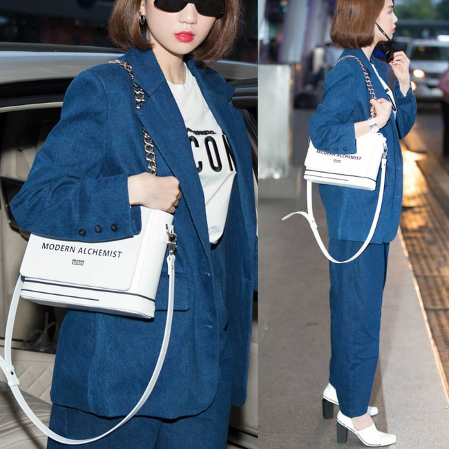 Thay vì chọn áo len cổ cao tím lịm, "nữ hoàng nội y" mix bộ suit với áo t-shirt xì tin và tất cả đã tạo nên tổng thể rất trẻ xinh, năng động, độ sành điệu cũng tăng thêm vài nấc.