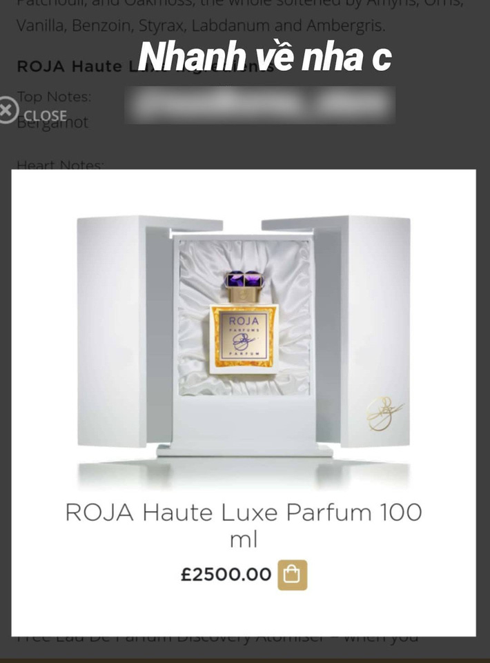 Mới đây, trên story Instagram, netizen lại bắt gặp Ngọc Trinh đang háo hức đợi ngày cầm trên tay lọ nước hoa đẳng cấp ROJA Haute Luxe Parfum của Roja Dove, thương hiệu nước hoa xa xỉ Anh Quốc. Dù có thể đoán trước nhưng không ít người vẫn "toát mồ hôi" khi biết mức giá của sản phẩm này là 2.500 bảng Anh (~ 74,8 triệu đồng).