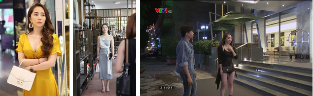 Vào vai cô nàng "kẻ thứ 3" chen ngang giữa mối quan hệ Vũ – Thư, Nhã cũng liên tục diện những trang phục hở hang, sexy không đúng với cương vị nhân viên tài chính cao cấp hay đối tác làm việc. Thậm chí nhiều trang phục của cô còn bị chê phản cảm vì hở trên hở dưới đến suýt hớ hênh.