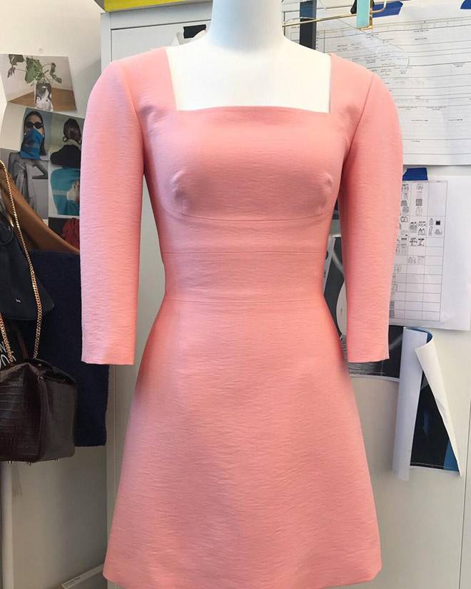 Mẫu váy có màu hồng nữ tính, cổ vuông cổ điển rất phù hợp với vẻ đẹp của Song Hye Kyo.