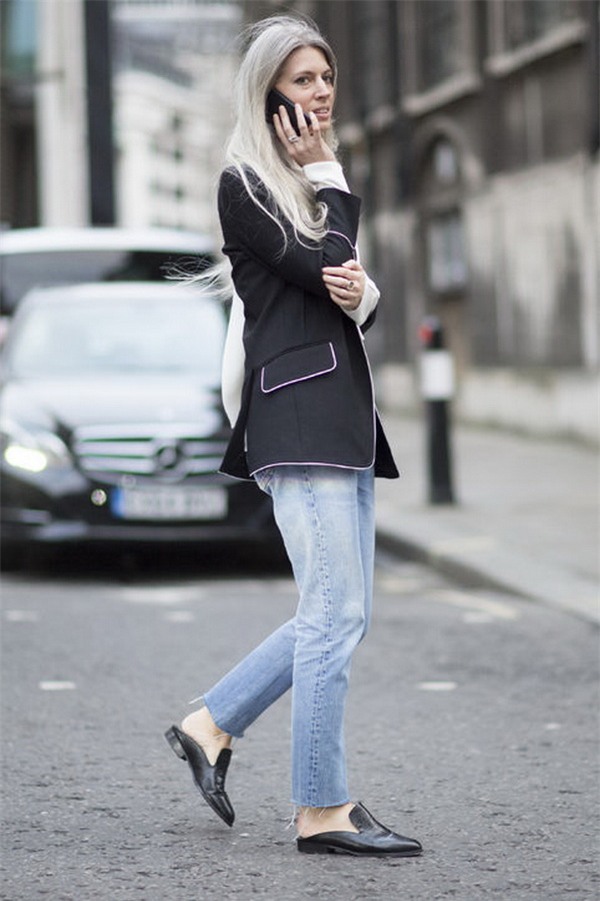 Kết hợp một chiếc quần jeans đen với áo sơ mi kiểu cách cùng áo khoác blazer đen có cúc kim loại và một đôi boot hở mắt cá chân sẽ giúp bạn đẹp hoàn hảo vì đây là gam màu đơn giản nhưng vẫn cực kì nổi bật.