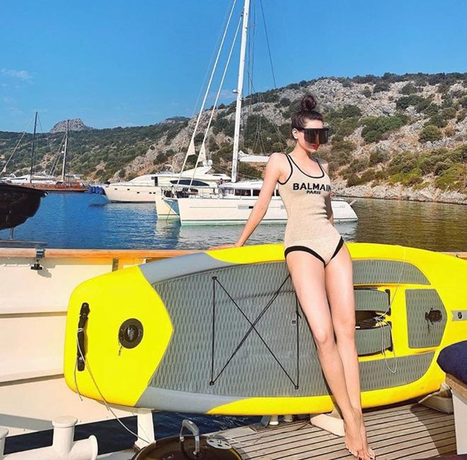 Bộ bodysuit Balmain được cô trưng dụng lại trong kỳ nghỉ với bạn trai Kim Lý.