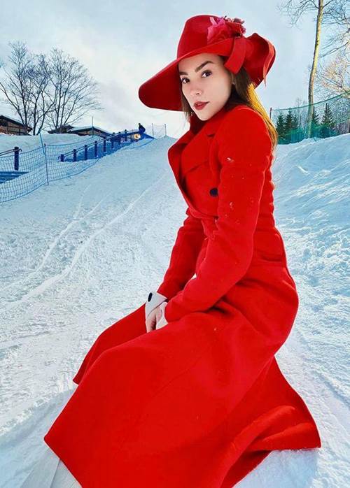 Mới đây, Hồ Ngọc Hà đã một lần nữa khiến fans không khỏi thích thú với màn lên đồ cực sang trọng giữa không gian tràn ngập tuyết trắng. Nhìn qua người ta cũng có thể đoán ra nữ ca sĩ đang chụp hình tại một khu trượt tuyết ở nước ngoài. Tuy nhiên, thay vì diện quần áo thể thao hay đồ bảo hộ, Hà Hồ lại lựa chọn diện chiếc áo choàng dài mang gam màu đỏ rực, phối cùng mũ rộng vành ton-sur-ton đầy sang trọng. Không chỉ giúp tôn lên nước da trắng hồng của Hà Hồ, gam màu đỏ của set đồ còn giúp nữ ca sĩ có như nổi bần bật giữa không gian tuyết trắng.