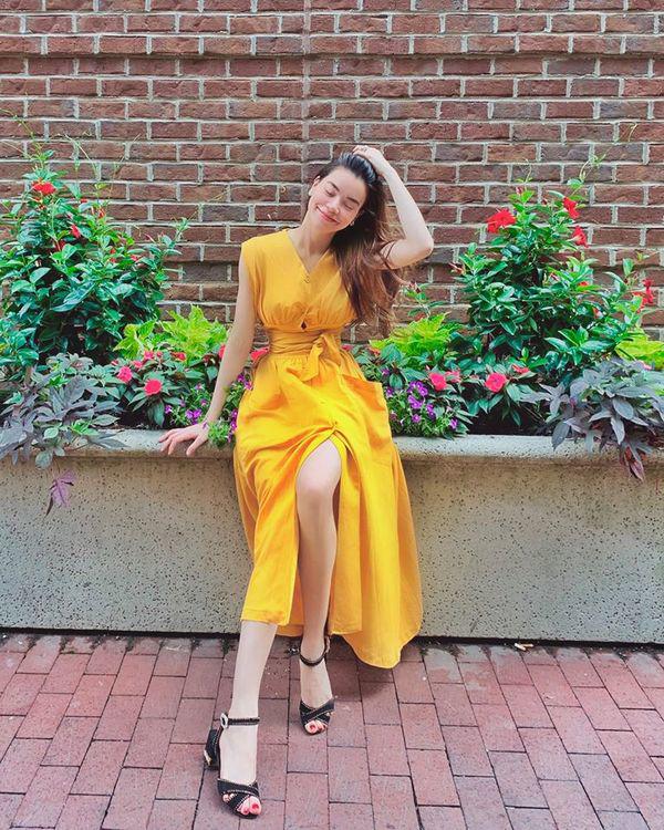 Trang phục mang gam màu vàng tạo nên vẻ tươi trẻ cho diện mạo Hà Hồ, đồng thời giúp người đẹp khoe khéo nước da trắng ngần.