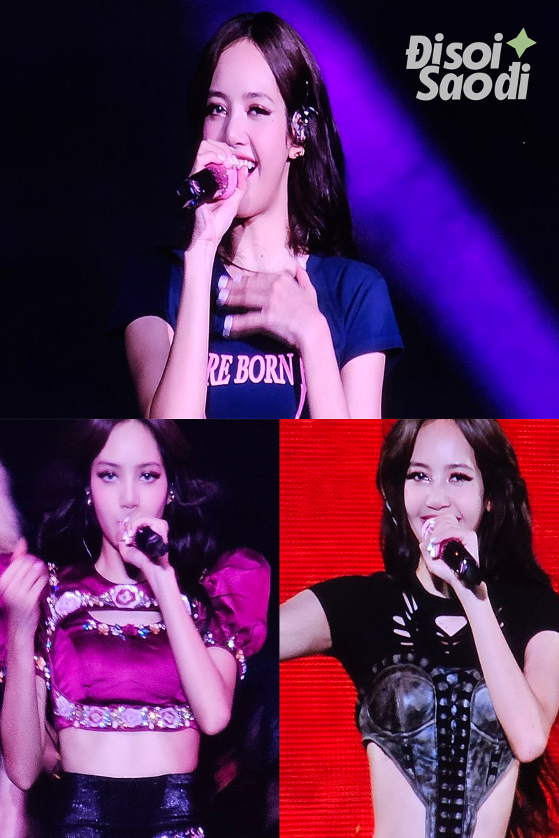 Dù thời tiết ngày 2 còn khá nóng nhưng Lisa vẫn mạnh dạn xõa tóc, khoe tóc mây bồng bềnh và đặc biệt, cô còn vén tóc mái 10 tỷ won lên cao hơn. Đa phần, Lisa không thay đổi nhiều phụ kiện mà phải tới set encore cuối, cô mới dùng cặp tóc Celine để thêm phần khác lạ