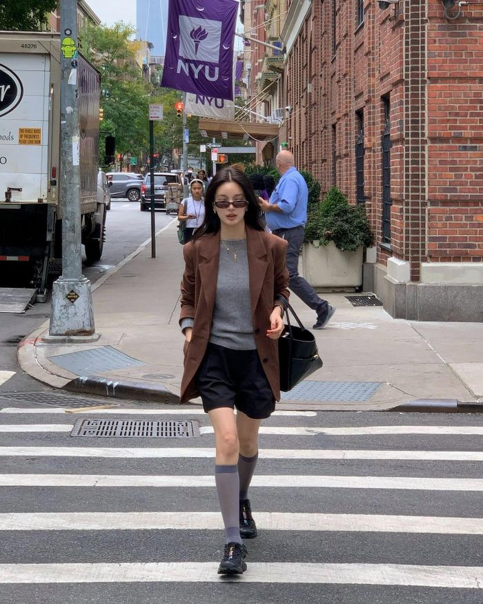 Tổng thể trang phục còn trở nên ấn tượng hơn nữa khi các nàng kết hợp blazer với quần short, giày sneaker và tô điểm phụ kiện vàng.