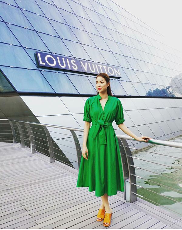 Phạm Hương nổi bần bật với váy xanh lá dáng dài kết hợp dép mule vàng cam sành điệu.