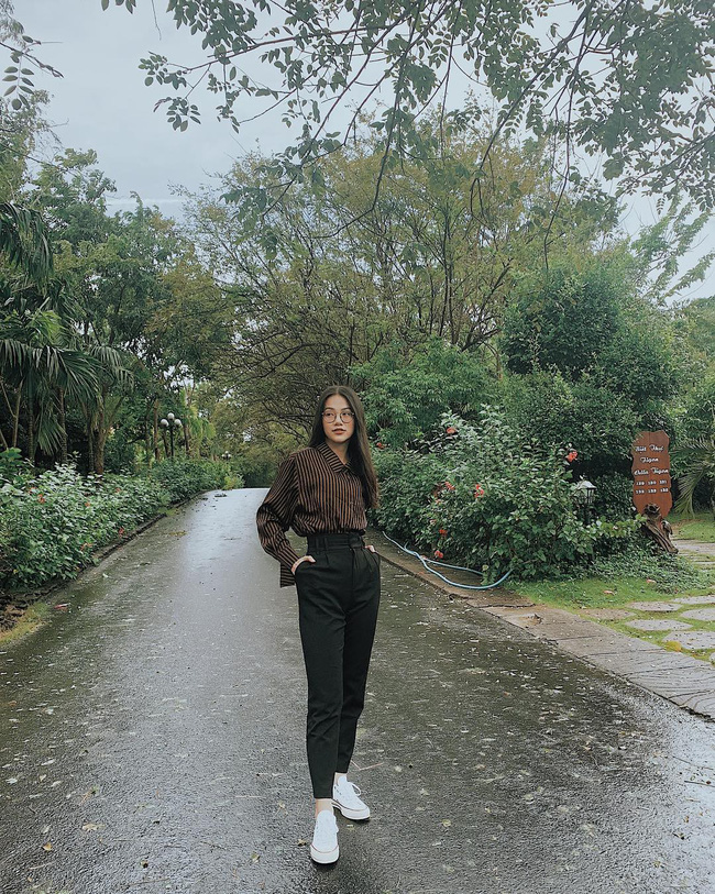 Phương Khánh chỉ cần sơmi kẻ sơvin gọn gàng cùng quần âu và giày sneakers trắng cũng khiến fan mãn nhãn trong street style sao Việt lần này. Đặc biệt set đồ kín đáo nhưng vẫn phô diễn được vòng eo thon trứ danh của nàng Hậu quốc tế.
