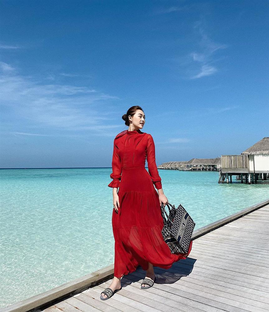 Á hậu Tường San nổi bật giữa biển trời Maldives nhờ chiếc váy đỏ bay bổng. Người đẹp mix cả cây túi xách, dép lê sang chảnh của Dior.