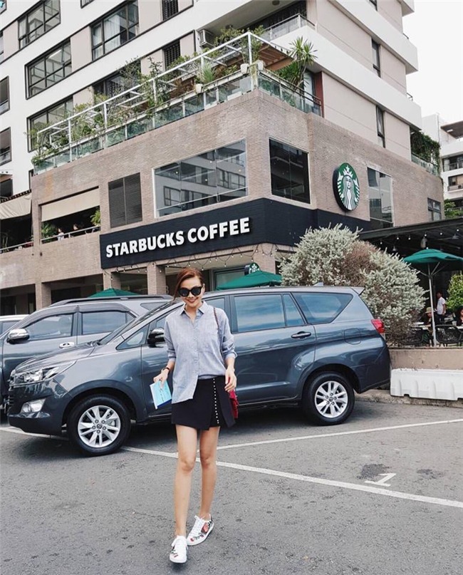 Siêu mẫu Thanh Hằng khoe chân dài với váy mini ngắn mix sơ mi cùng đôi giầy Gucci nổi bật.