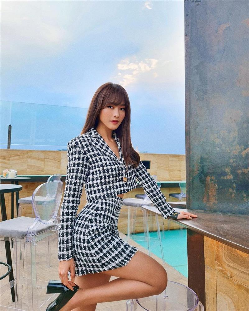 Dù style đa dạng và cá tính đến đâu thì một cô nàng sành điệu cũng không thể bỏ qua những mẫu váy vóc xinh tươi, điệu đà. Khả Ngân không ít lần hoàn thiện phong cách với váy nữ tính nhưng gu chọn đồ của cô lại rất khác trong phim. Nếu như Tuệ Nhi chuộng các mẫu váy thanh lịch, nhẹ nhàng và khá kín đáo thì Khả Ngân ngoài đời lại dành sự ưu tiên cho váy hai dây mảnh, hay váy hở lưng… Lựa chọn của Khả Ngân giúp cô ghi mạnh điểm gợi cảm, phóng khoáng và còn tôn được vóc dáng chuẩn. Đôi khi, Khả Ngân cũng sẽ tìm đến những lựa chọn thanh lịch, sang chảnh hơn, chẳng hạn như set áo vest + chân váy ngắn vải tweed.