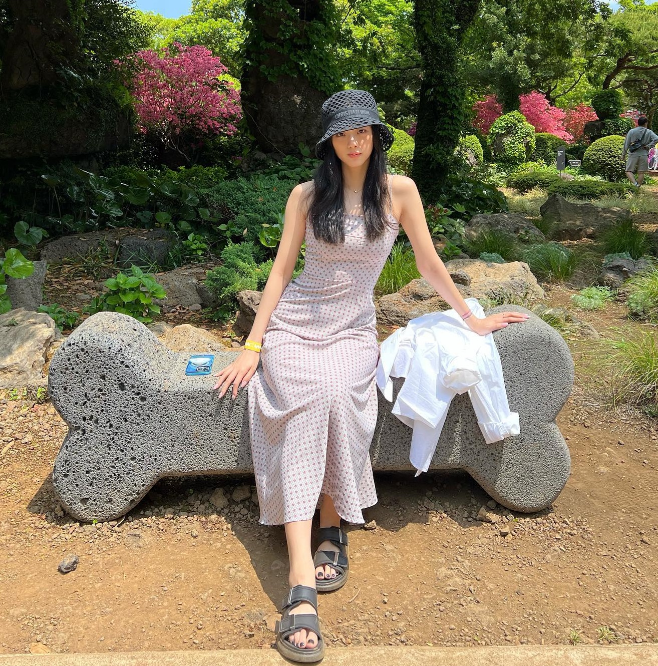 Mẫu váy hai dây tông màu hồng nhạt của Jisoo có sự nổi bật, tươi tắn nhưng cũng đầy tinh tế. Thiết kế không quá ôm sát nhưng vẫn gọn gàng của mẫu váy sẽ giúp tôn dáng hiệu quả. Jisoo đã chọn đôi sandal đế thô và chiếc mũ bucket để hoàn thiện bộ trang phục sành điệu, hút mắt.