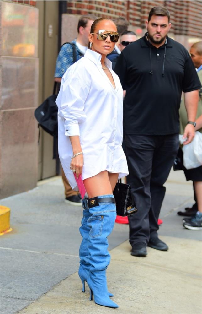 Xuất hiện trên đường phố New York vào 31/7 vừa qua, J.Lo đã khiến dân tình phải trầm trồ vì diện mạo quá đỗi nổi bật và sành điệu của mình. Cô ăn vận vô cùng trẻ trung với áo sơ mi trắng và cặp kính oversize choán nửa khuôn mặt. Thật khó tin nữ ca sĩ vừa tổ chức sinh nhật lần thứ 49 và chuẩn bị bước sang "đầu 5".
