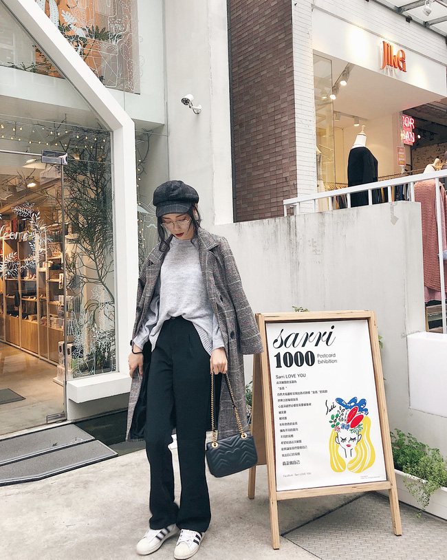Đơn giản nhưng không bao giờ nhàm chán và trẻ trung bất ngờ chính là công thức áo len ghi xám + quần đen dáng suông, khoác ngoài áo dạ kẻ ô và hoàn thiện bằng đôi giày sneakers khỏe khoắn, năng động.