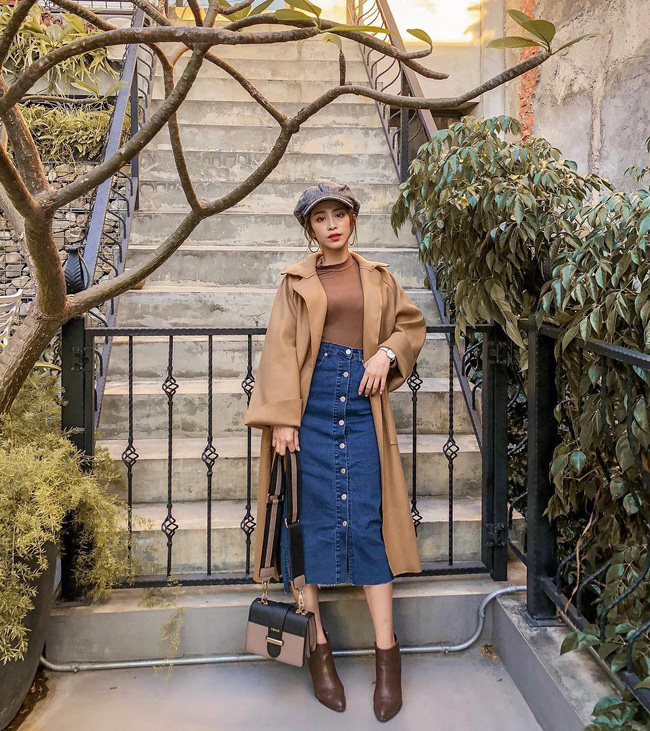 Tưởng rằng những items màu nâu sẽ mang đến vẻ ngoài hơi "dừ" cho các nàng nhưng khi tô điểm thêm chiếc chân váy denim, set đồ còn trở nên trẻ trung, sành điệu và quyến rũ hơn bội phần; bên cạnh đó, nét thanh lịch của gam màu nâu cùng vẻ nữ tính của chân váy bút chì vẫn được bảo toàn tuyệt đối.