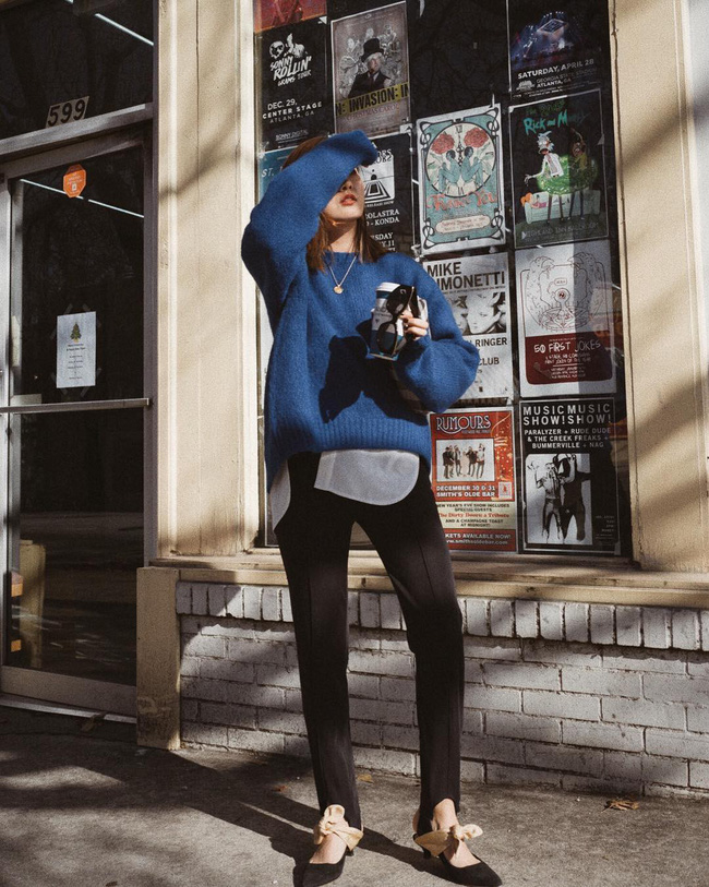 Cũng không thể bỏ qua công thức áo len + quần vải cứ "mặc lên là đẹp" này; và nếu bạn cũng chọn cho mình chiếc áo len màu mè thì đảm bảo là nổi bật và trẻ trung lắm.