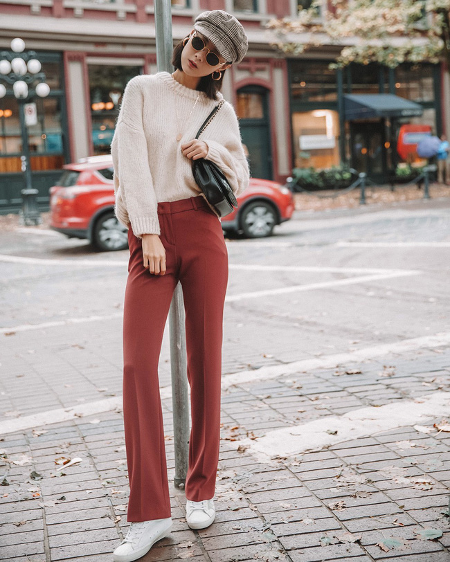 Dù chỉ áp dụng công thức rất đơn giản với áo len + quần vải và hoàn thiện bằng đôi sneakers thôi nhưng sự kết hợp giữa màu trắng kem và đỏ trầm quả là xuất sắc đến độ khiến người ta không thể rời mắt.