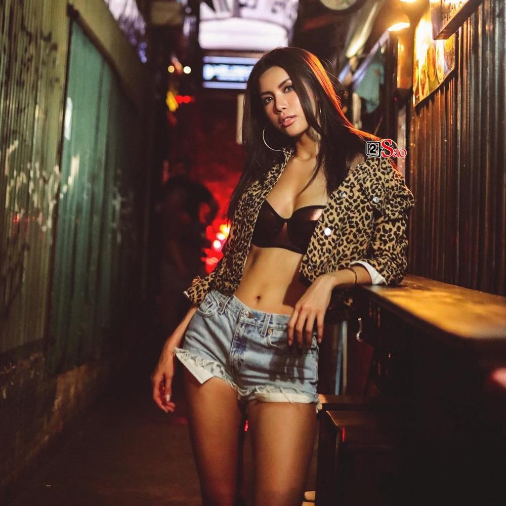 Nếu muốn học tập phong cách sexy sporty chic của Minh Tú thì cứ mix bra top, short jeans tua rua và jacket da báo là bảo đảm "chất chơi vô đối"