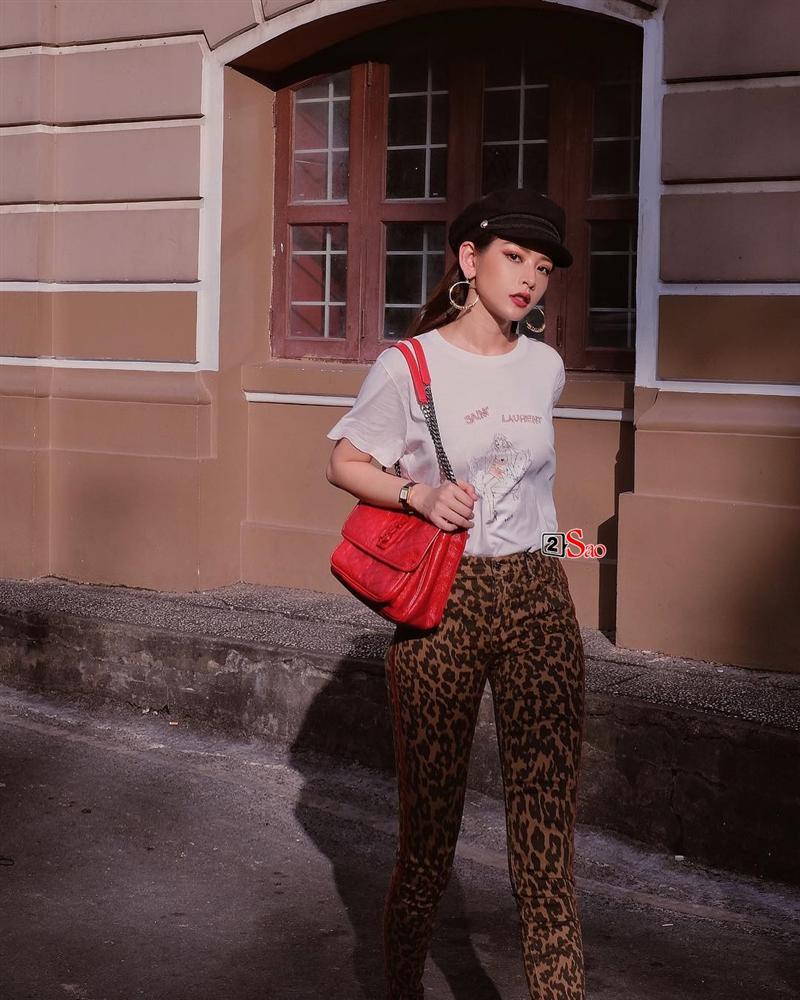 Chi Pu thì lại nâng tầm cho quần da báo với áo phông và túi Yves Saint Laurent và đồng hồ Hermes. Có ai nhận thấy là khuyên tai vòng rất hợp khi đi cùng họa tiết da báo không?