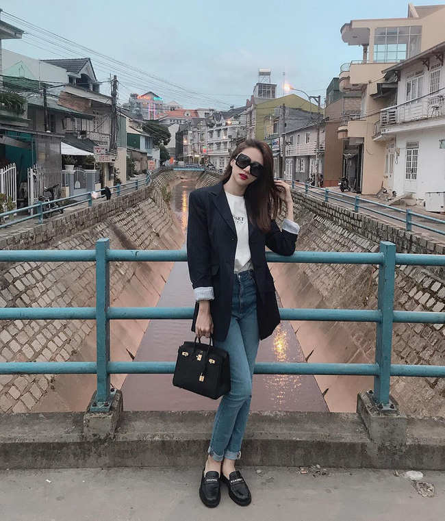 Làm thế nào để một set đồ với blazer + quần đen + áo thun trắng trở nên nổi bật? Câu trả lời chính là tô điểm một đôi khuyên tai thật lồng lộn như cách mà Hương Giang hoàn thiện phong cách.