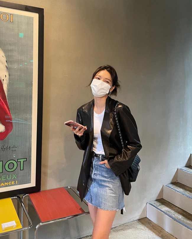 Sooyoung (SNSD) trông rất bụi bặm khi diện chân váy denim ngắn với áo thun, rồi khoác ngoài blazer da. Dù chất chơi là vậy, outfit này vẫn có được vẻ thanh lịch nhờ mang tông màu trung tính làm chủ đạo, và được sơ vin gọn gàng, chỉn chu.