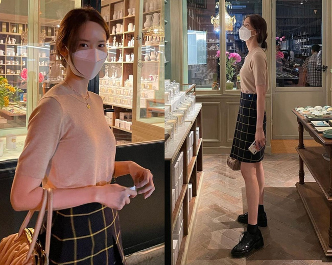 Yoona (SNSD) thì vừa ngọt ngào, vừa trang nhã chỉ nhờ cách lên đồ rất đơn giản, đó là kết hợp áo len mỏng màu be với chân váy ngắn kẻ ô. Kết lại set trang phục, Yoona diện giày Oxford độn đế, nên trông càng sành điệu.