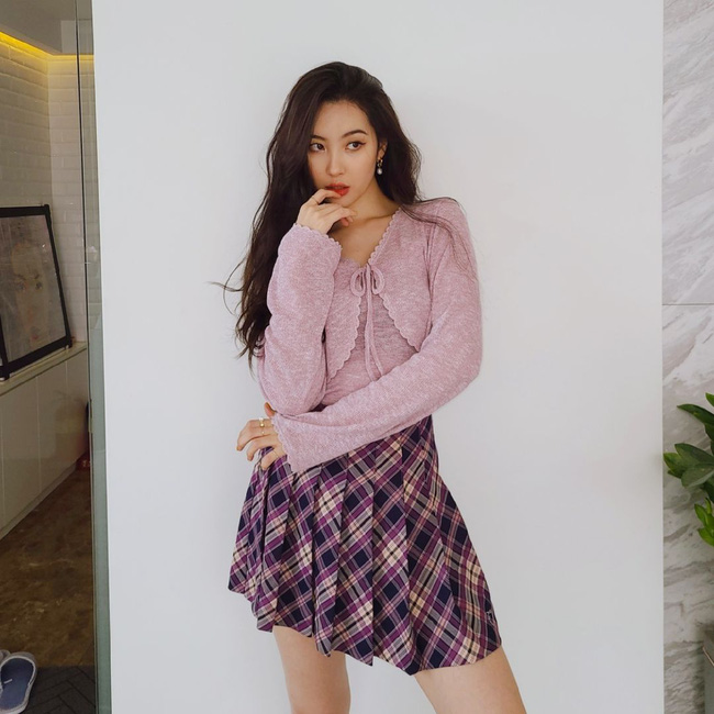 "Nữ hoàng solo" Sunmi đã 29 tuổi nhưng vẫn chinh phục "ngon ơ" set trang phục ngọt ngào gồm áo len màu hồng nhạt, kết hợp với chân váy kẻ. Không chỉ hack tuổi tốt, outfit này còn toát lên sự quyến rũ và nữ tính.