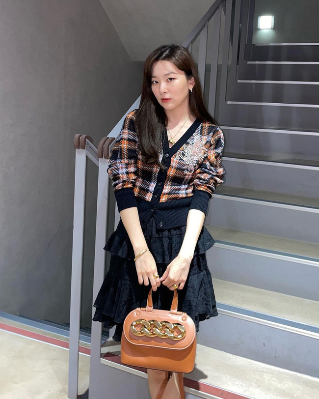 Seulgi kết hợp áo cardigan với chân váy ngắn xếp tầng nên dù outfit mang tông màu trầm làm chủ đạo, vẻ ngoài của cô vẫn rất nổi bật.