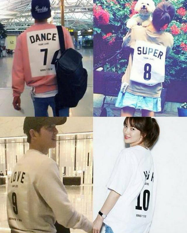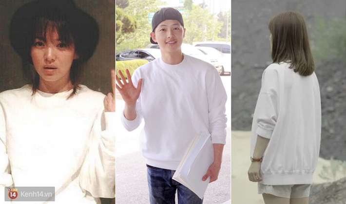 Ngoài chiếc sweatshirt màu ghi ở trên, Song - Song dường như còn mặc chung một chiếc sweatshirt trắng. Song Joong Ki từng diện nó trong buổi đọc kịch bản "Hậu Duệ Mặt Trời" hồi năm ngoái còn Song Hye Kyo đã "mặc lại" nó trong phim và cả ngoài đời.