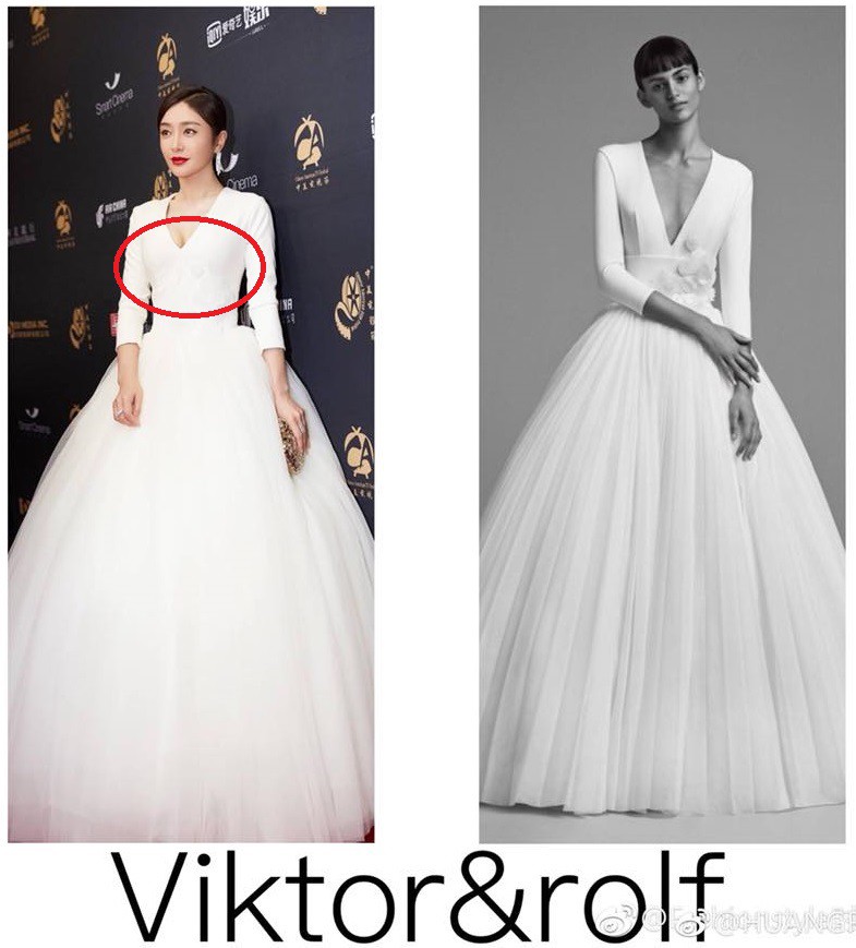 Mẫu váy đầu tiên mà Tần Lam đã diện là 1 thiết kế của Viktor&rolf, dễ thấy cô đã chỉnh sửa, may bớt phần cổ chữ V xẻ sâu để váy kín đáo hơn.