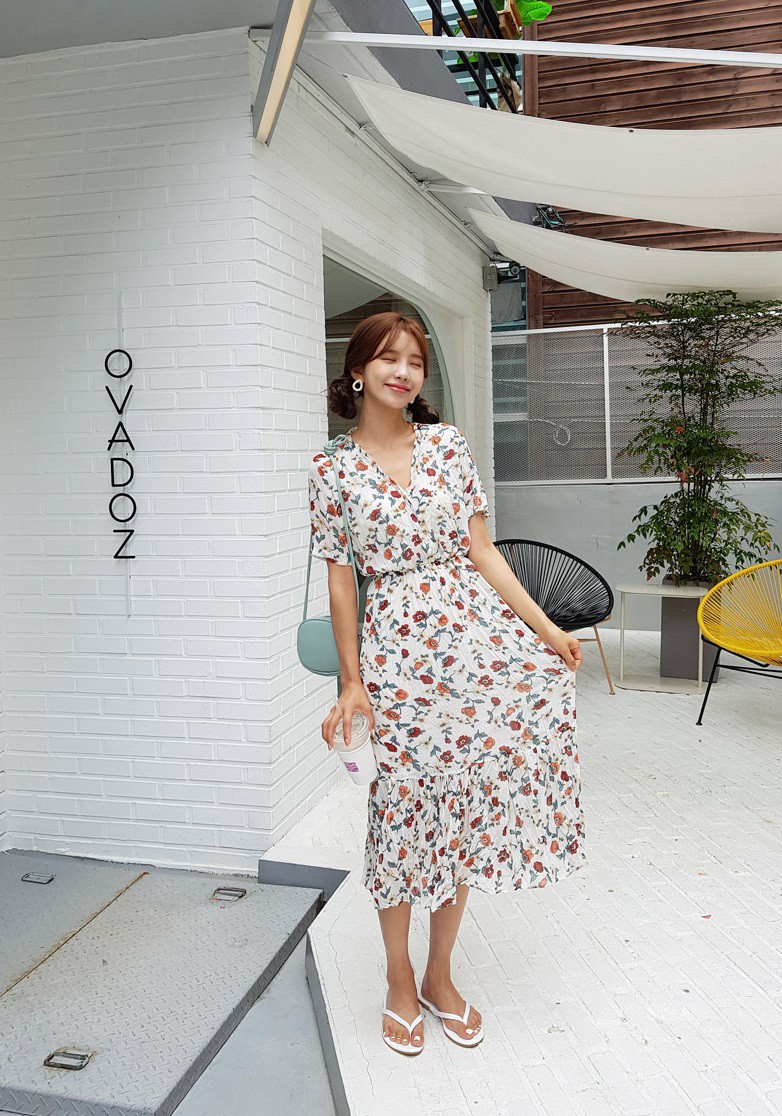 1. Váy hoa dáng ngắn, cổ chữ V