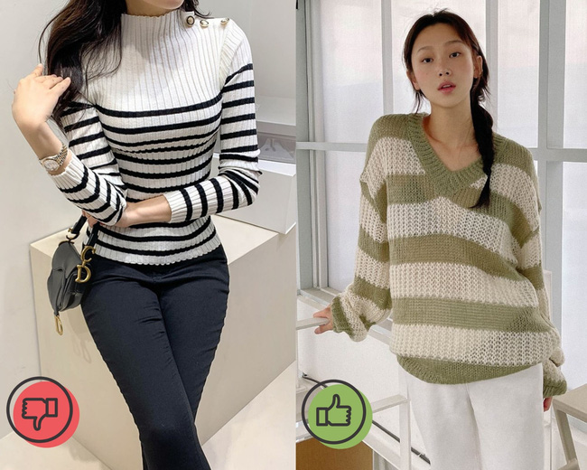Áo len kẻ ngang, dáng ôm dù có thể giúp tôn lên những đường cong quyến rũ, nhưng lại không được đánh giá cao lắm ở vẻ thời thượng. Nhất là khi chị em chọn áo kẻ ngang bản to, vẻ ngoài còn dễ hóa "sến sẩm", lỗi thời. Thích diện áo kẻ ngang thì lựa chọn chắc ăn nhất vẫn là áo dáng oversized. Phiên bản này dễ mặc, hợp với mọi vóc dáng và giúp chị em hoàn thiện vẻ ngoài trẻ trung, nhưng vẫn thanh lịch.